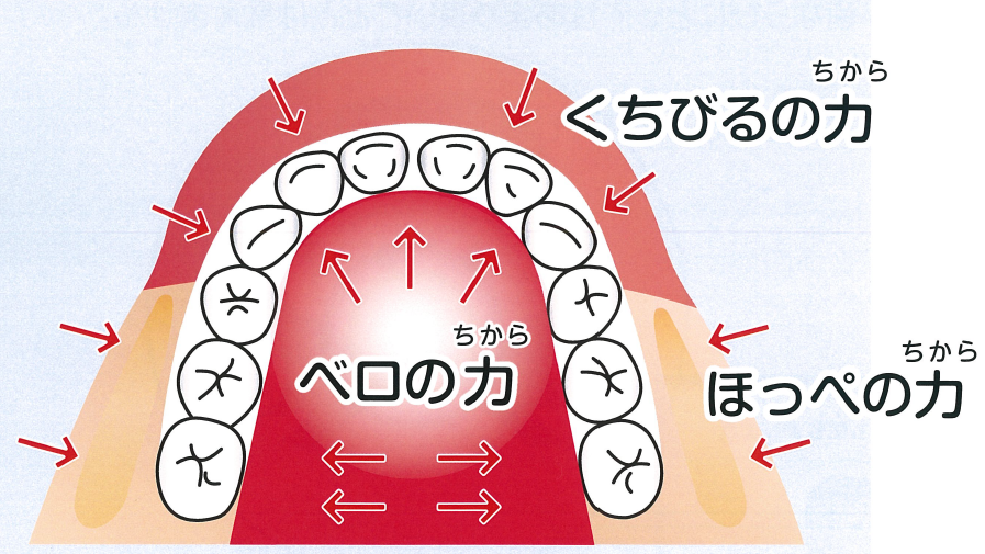 このきれいな歯並びで毎日食事をすると、下の顎も成長が促され、上の歯同様にきれいな歯並びになります。反対に、舌の位置が異常なまま成長期を過ごしてしまうと、上顎に舌がないせいで、生えてきた永久歯は頬や唇などの筋肉に押されて自由な位置に生えてきます。